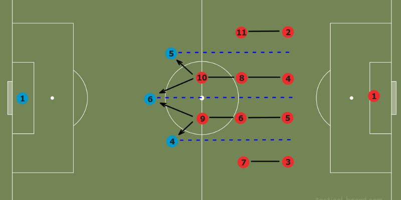 • Hai Tiền vệ trung tâm (CM): Thường được chia thành một tiền vệ phòng ngự (box-to-box hoặc tiền vệ trụ) và một tiền vệ kiến thiết lối chơi. Họ bao quát trục giữa, kiểm soát bóng, thu hồi bóng và phân phối bóng. Sự ăn ý của cặp đôi này quyết định khả năng kiểm soát thế trận.